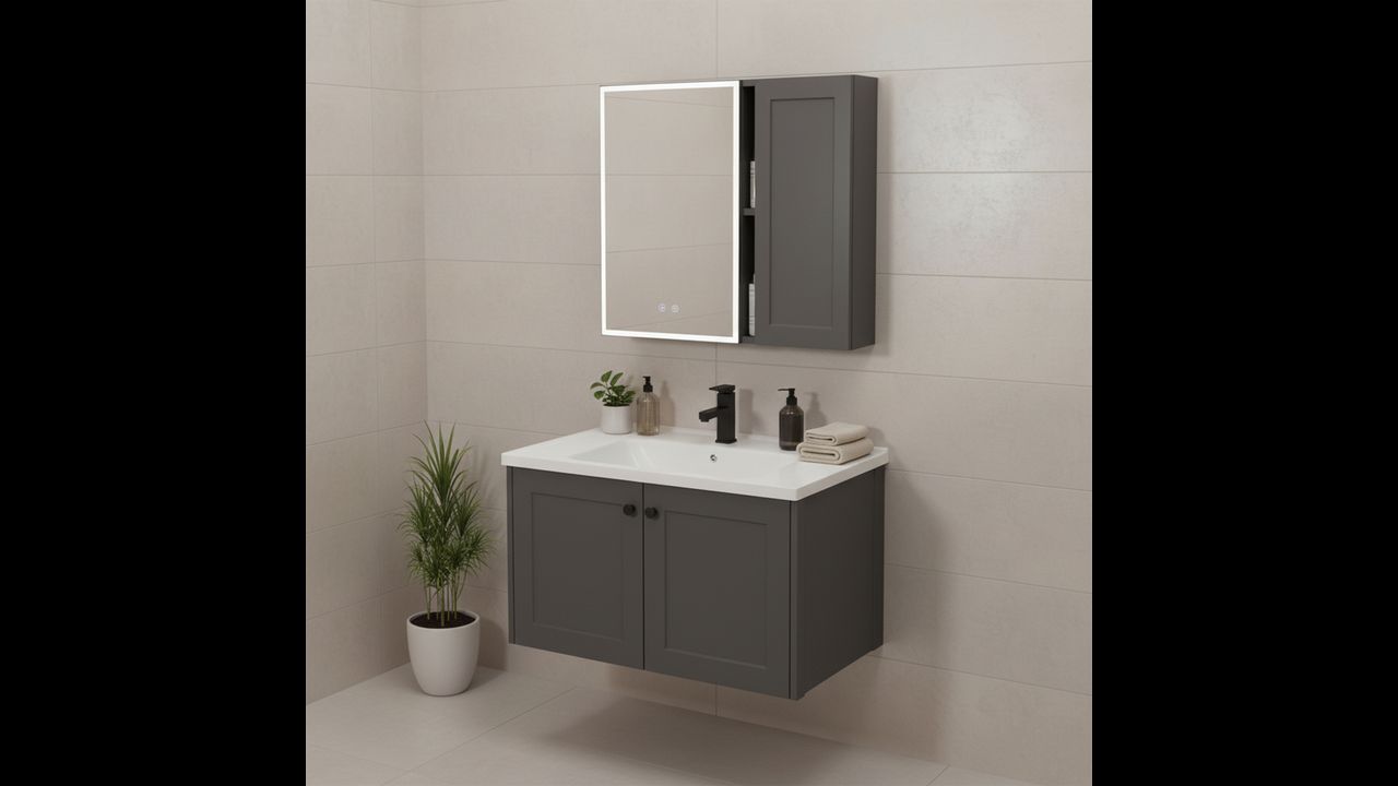 Appreciate elegance and modern style in your bathroom with the Rea Monti 60 bathroom furniture set in the distinctive Grey colour. This functional combination of a vanity unit, washbasin and mirrored cabinet will transform the look of your interior. The set has been designed to maximise available space while maintaining a light and aesthetic appearance.