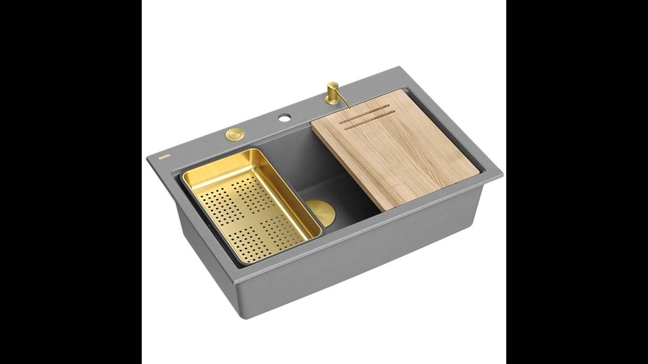 This model is very generously equipped with additional kitchen accessories. Included with the sink is – a liquid dispenser, a bamboo cutting board, a drainer and a rolled steel-silicone mat (not included in gold and copper variants).