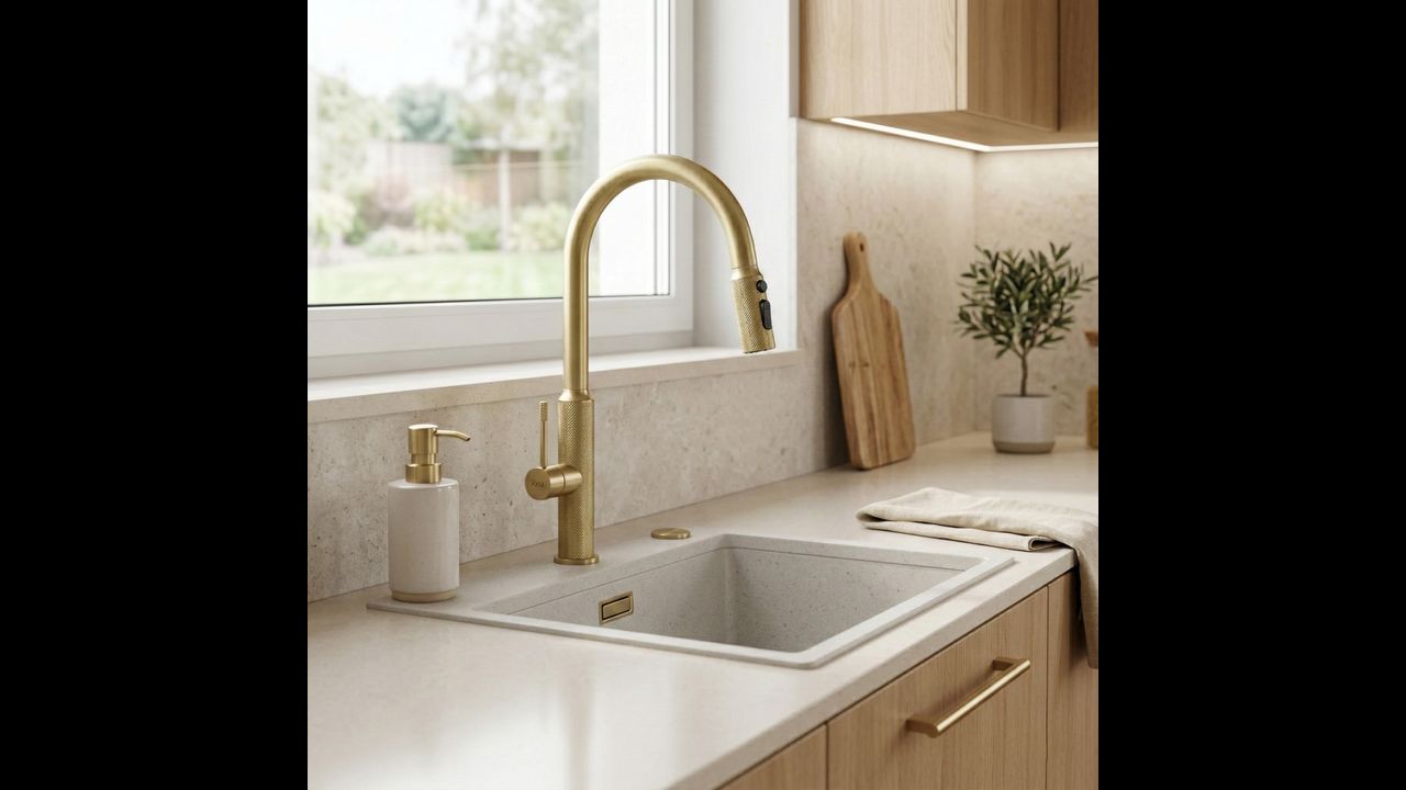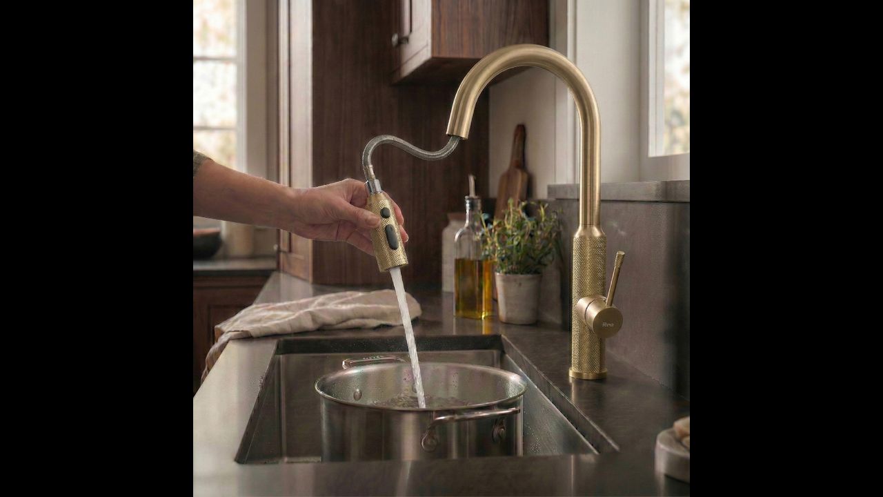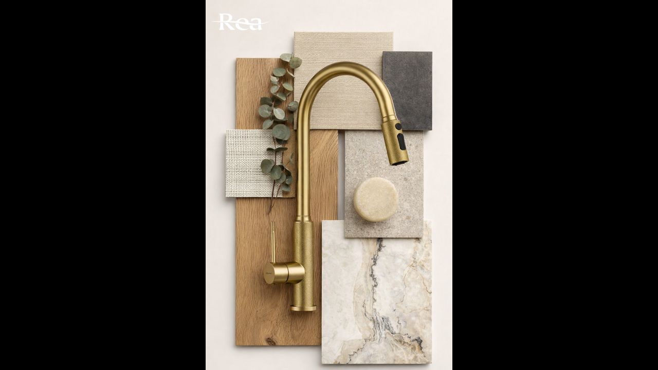 Rea Master kitchen tap in Brushed Gold combines luxurious design with advanced technology to elevate your kitchen. Made from solid brass and finished in a warm, matte tone, it’s a durable and highly aesthetic choice for those who value a premium look in their fixtures.