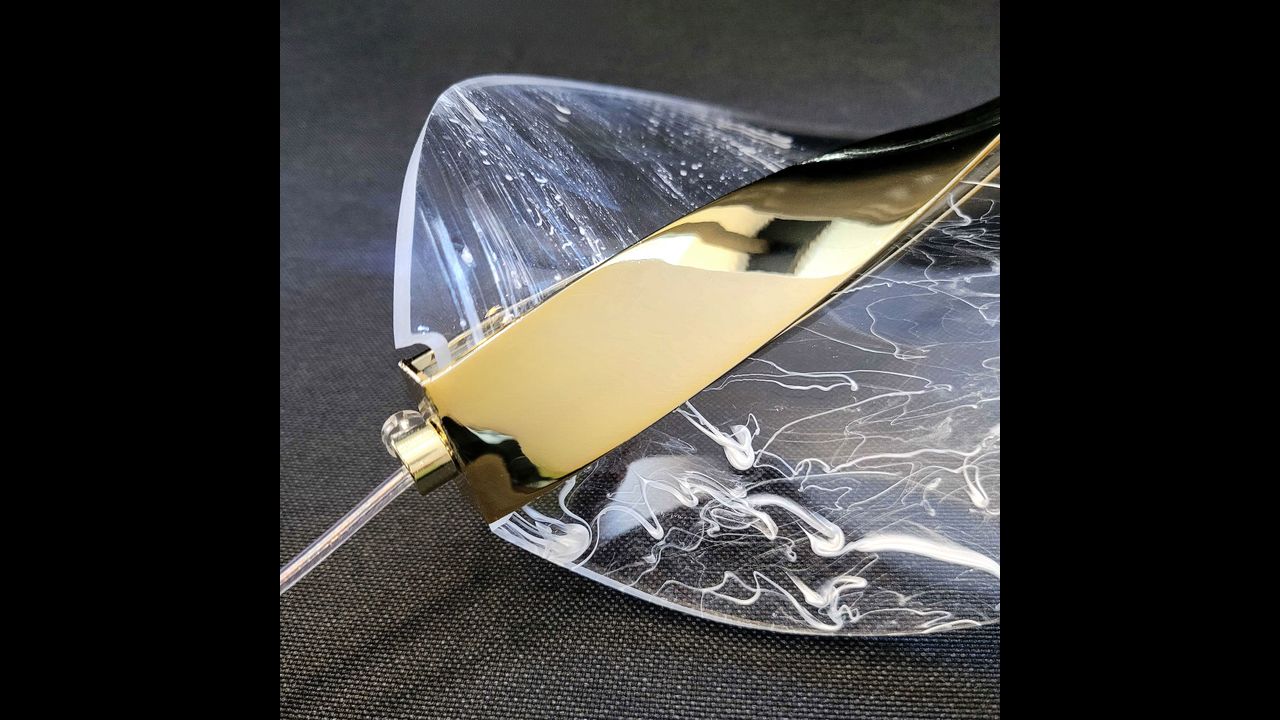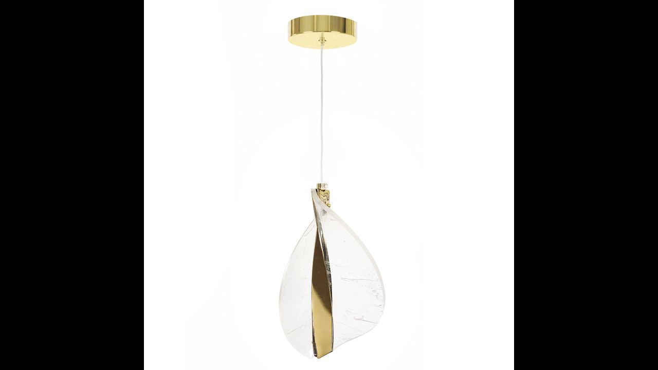 The modern LED lamp with a unique form is a perfect choice for those who appreciate subtle yet striking lighting. Its design, inspired by organic shapes, combines a glossy golden frame with a transparent acrylic element featuring a delicate pattern of white veins. The result is a light, artistic effect that looks stunning both in natural daylight and when the lamp is illuminated.