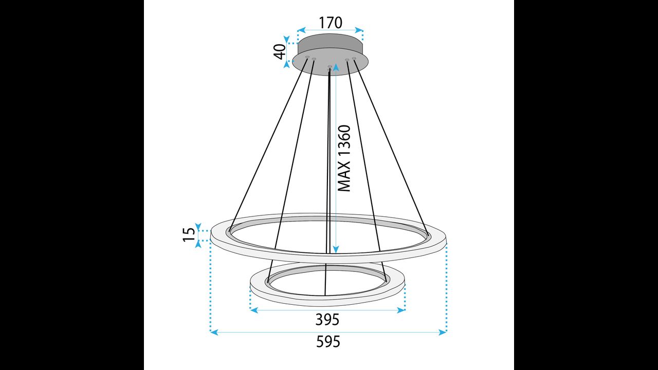 The modern LED chandelier with a 60 cm main ring diameter perfectly combines functionality and design. Two rings in a subtle brushed nickel finish create an impressive, spatial form that fits beautifully in a living room, dining area, or bedroom. The adjustable suspension cables and power lines allow the rings to be positioned either parallel or asymmetrical, offering flexibility in arrangement.