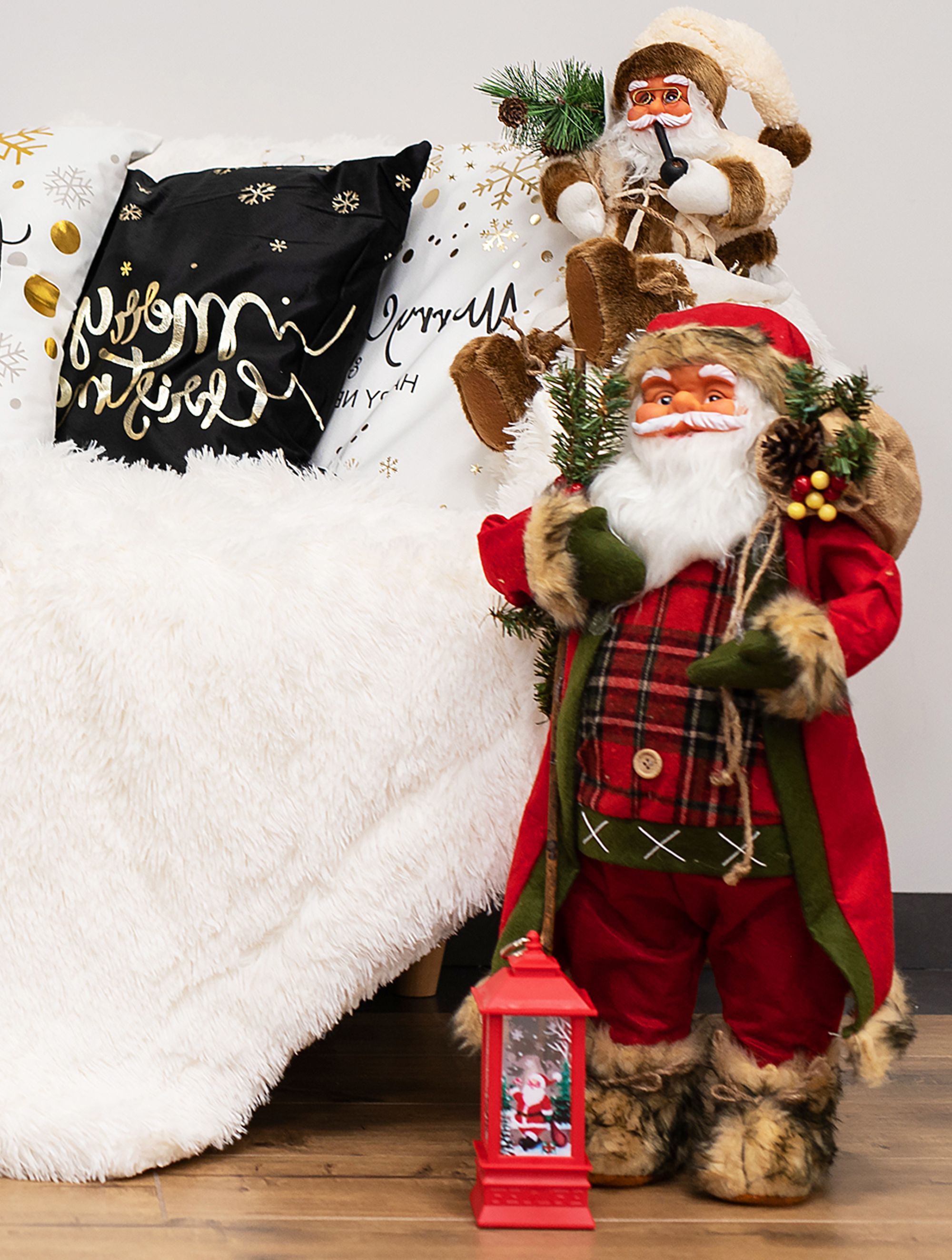 Przepiękna siedząca figurka Świętego Mikołaja to wspaniała ozdoba dla twojego domu, która wprowadzi Bożonarodzeniowy nastrój wśród domowników. Mikołaj posiada małe małe dzwoneczki, fajkę i worek z choinką z szyszkami. Figurka wykonana jest z tworzywa sztucznego i pokryta przyjemnym w dotyku bawełnianym ubrankiem zapewniającym trwałość i wysoką jakość wykonania. Ma stabilną konstrukcję i wysoką jakość wykonania.