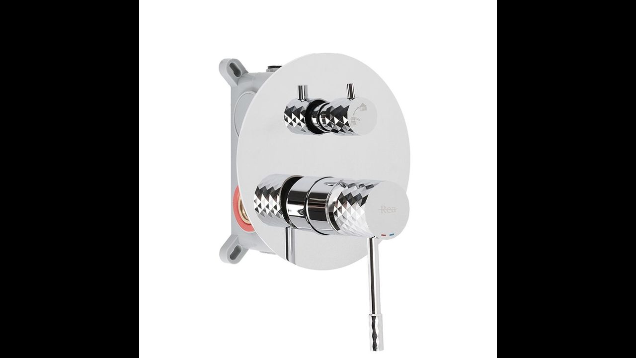 The entire set is made of high-quality materials, while the chrome coating adds exceptional shine and durability. The overhead shower delivers a consistent, relaxing water flow, while the slim hand shower ensures comfort in daily use. Distinctive diamond-cut knobs highlight the unique character of the set, giving it a luxurious look.
