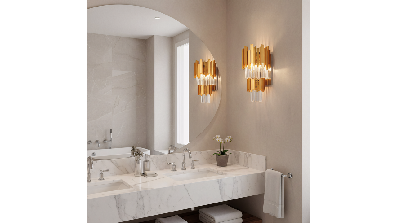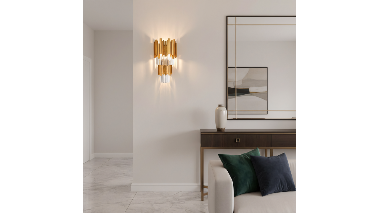 Hanging crystal elements give the sconce lightness and decorative depth, creating a delicate play of light on the wall. The sconce is designed for two E14 bulbs, allowing you to freely choose the colour temperature and brightness to suit your arrangement needs.