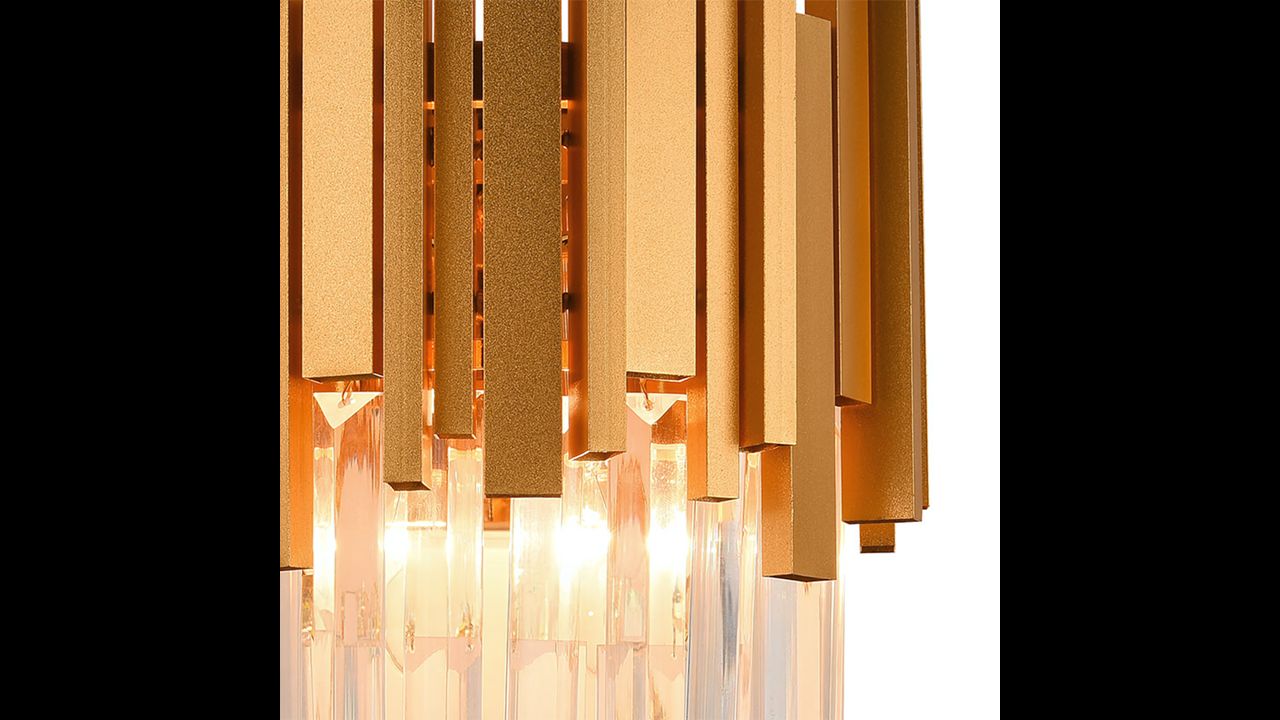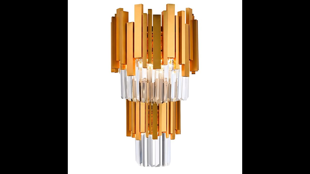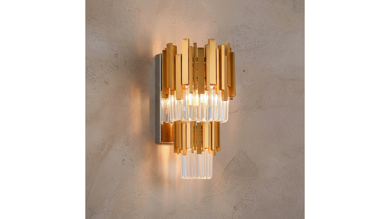 This stylish wall sconce is a bold choice for interiors where elegance and a striking detail matter. The structure is made of metal, and its front section in a gold finish creates a strong, modern contrast with decorative glass crystals that subtly reflect and diffuse the light. The whole design is completed by a rectangular wall plate in a chrome finish, adding a luxurious touch to the fixture.