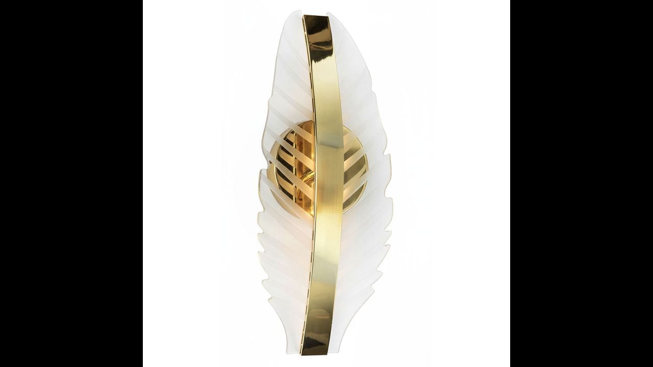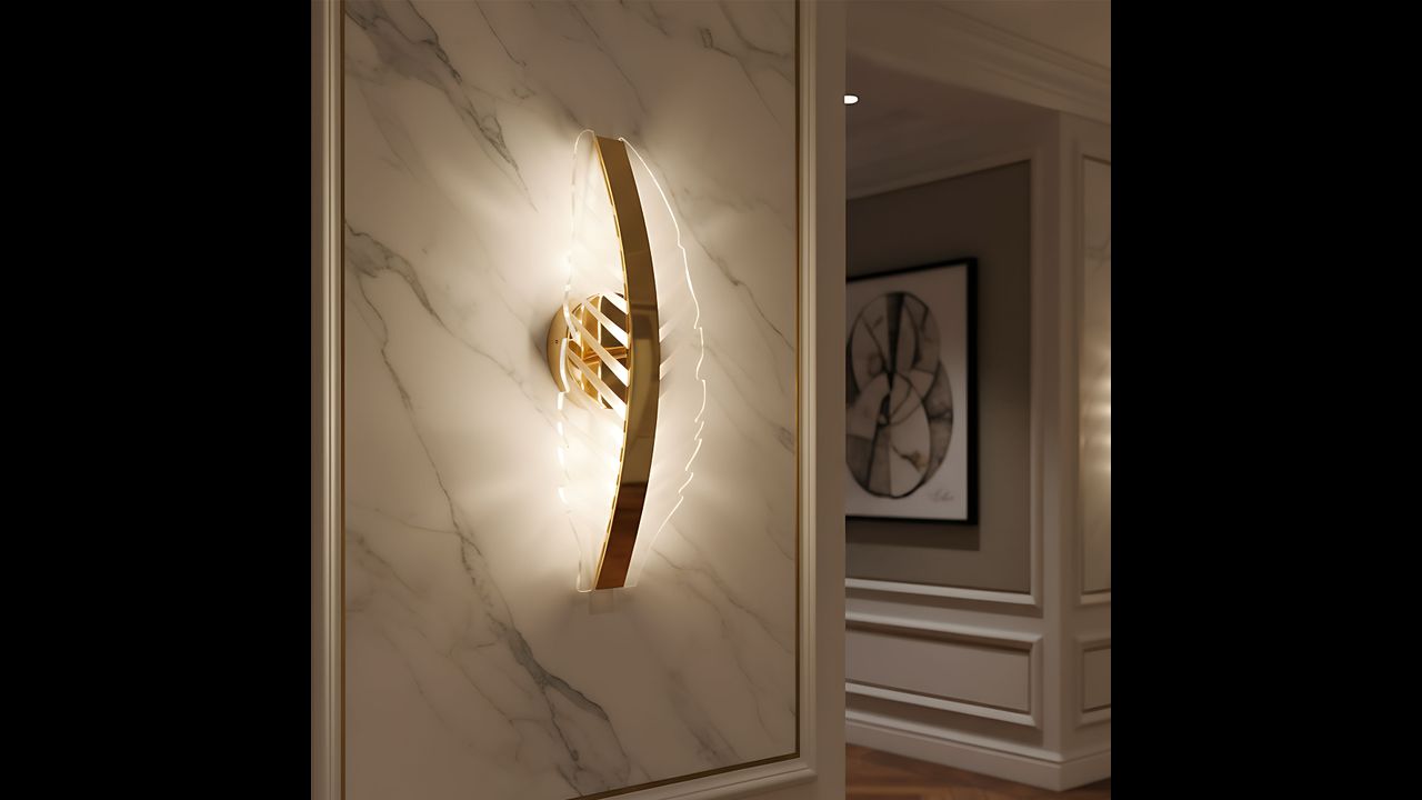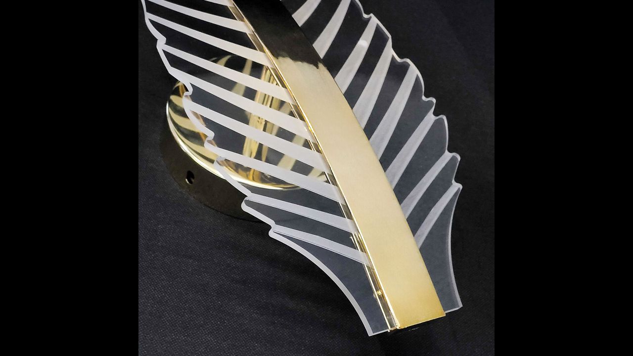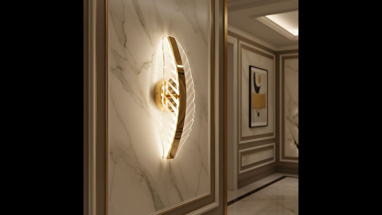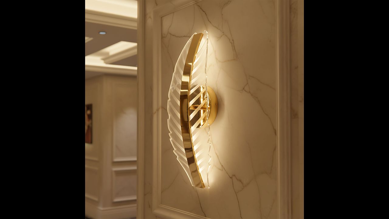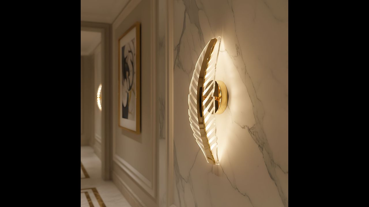 The modern LED wall lamp inspired by the shape of a leaf or feather combines elegance with soft, ambient light. The transparent engraved acrylic element gently diffuses the light, creating decorative reflections on the wall, while the golden frame adds a touch of luxury to the interior.
